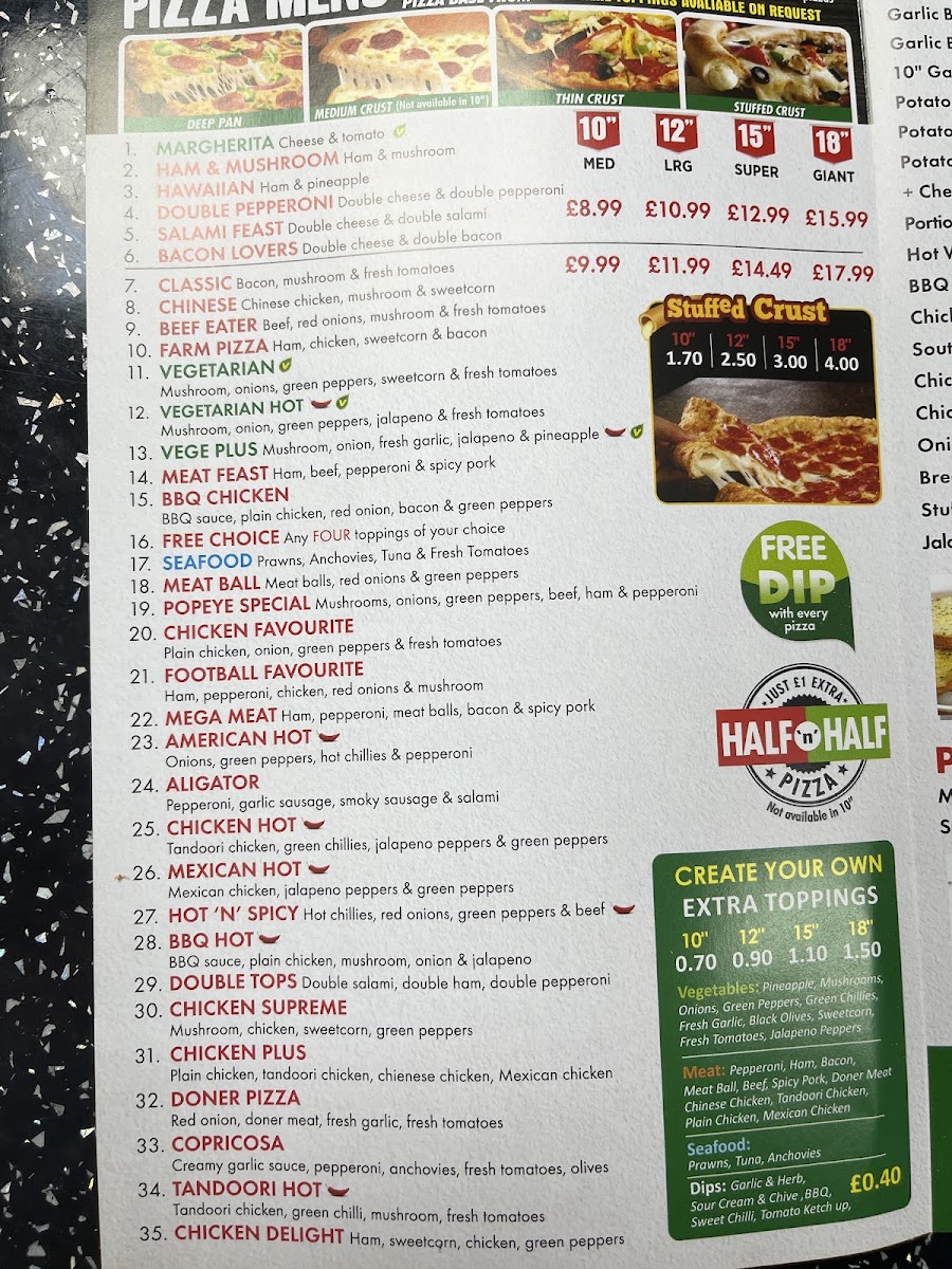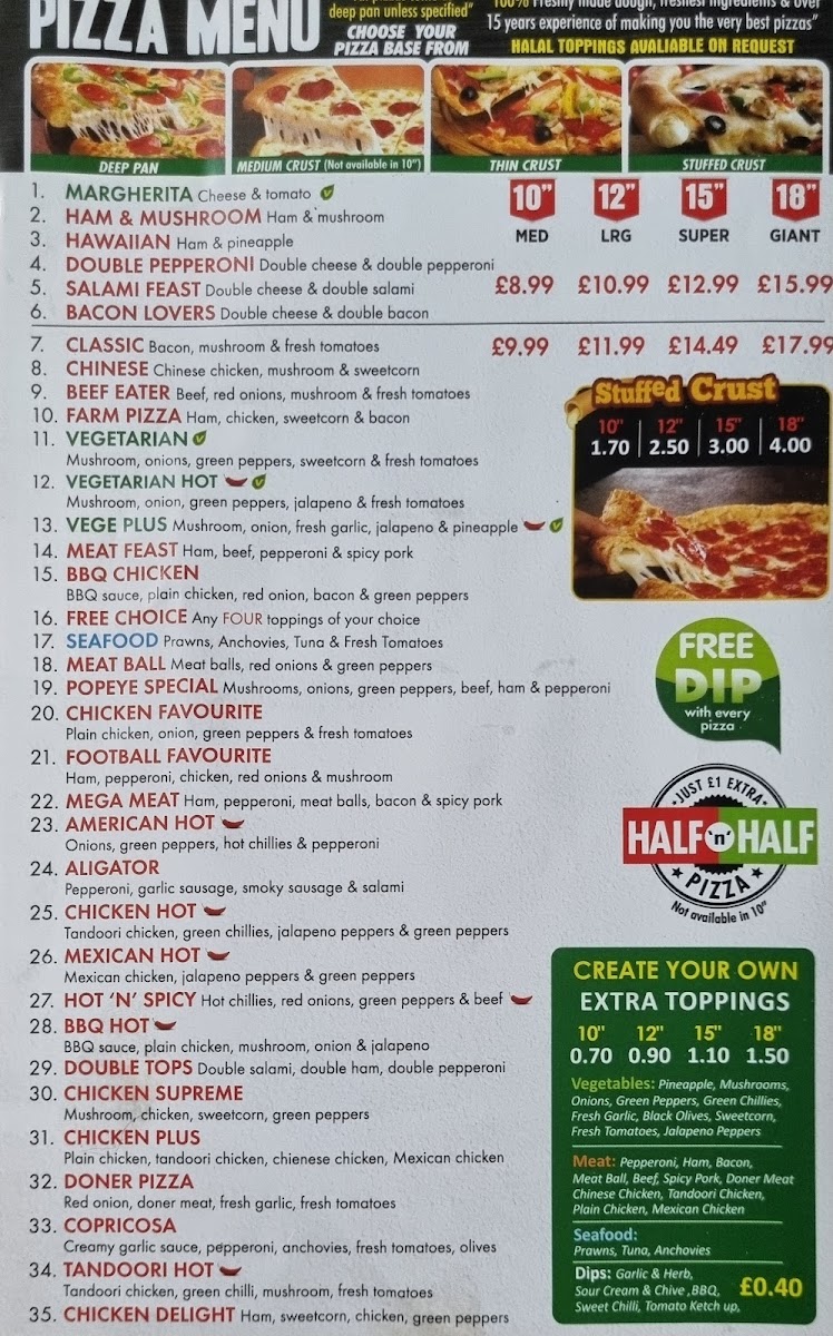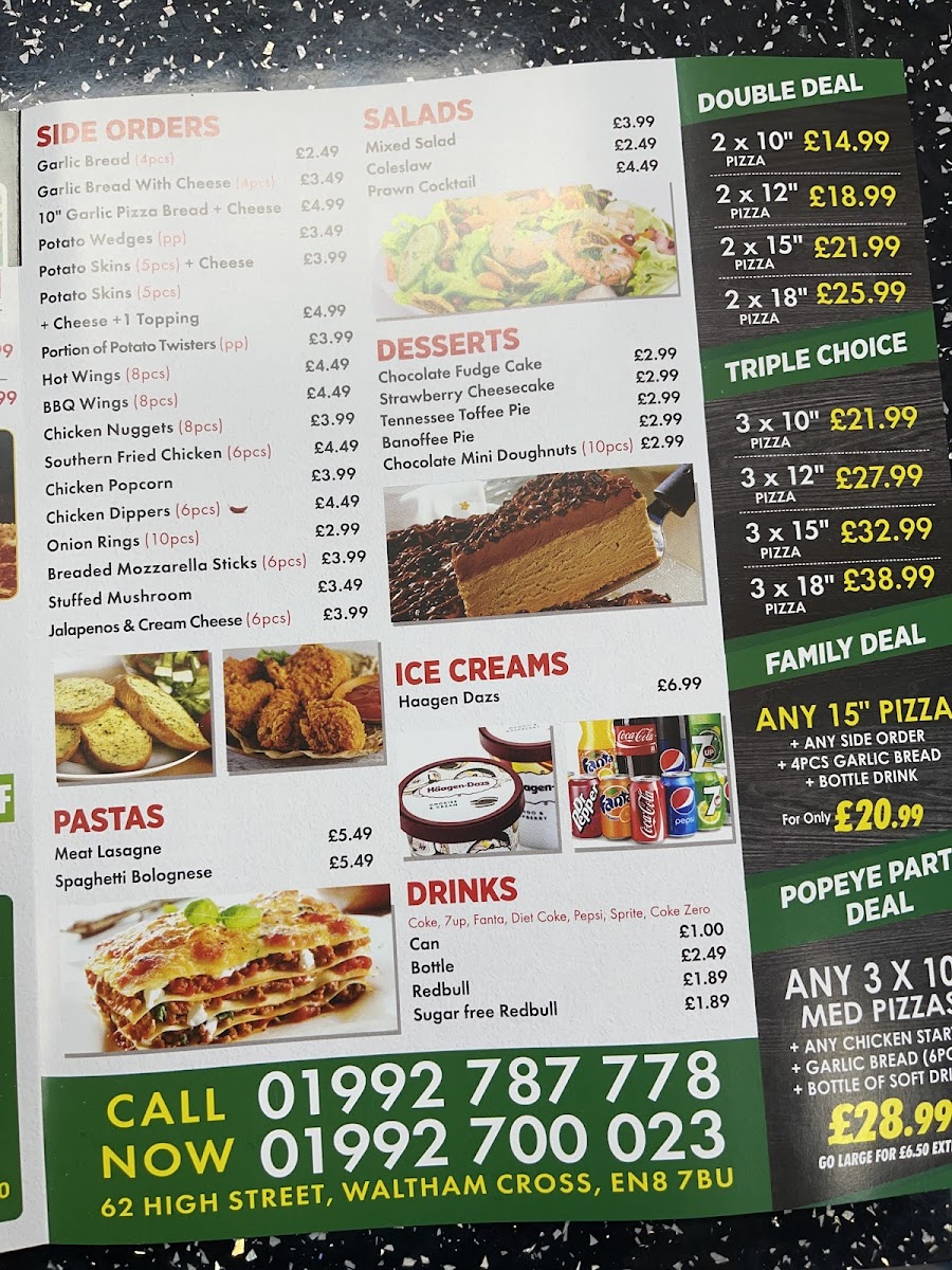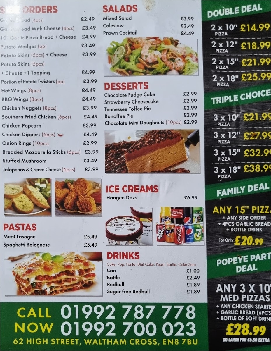 From a reviewer’s perspective, the menu at The Popaye Pizza offers a straightforward but satisfying selection, covering everything from classic sides to desserts and drinks at accessible prices. The side orders like Garlic Bread, Garlic Bread With Cheese, 10" Garlic Pizza Bread + Cheese, Potato Wedges, and Potato Skins (5pcs) + Cheese make great starters or add-ons, while the pasta options such as Meat Lasagne and Spaghetti Bolognese provide hearty alternatives to pizza. For lighter choices, the salads including Mixed Salad, Coleslaw, and Prawn Cocktail are simple but welcome additions. Dessert lovers can enjoy sweet treats like Chocolate Fudge Cake, Strawberry Cheesecake, Tennessee Toffee Pie, Banoffee Pie, and Chocolate Mini Doughnuts, which round off the meal nicely. The drink selection features Can, Bottle, Redbull, and Sugar Free Redbull, and the pizza range includes popular choices such as Margarita, Vegetarian, Vegetarian Hot, Vege Plus, and Ham & Mushroom, ensuring there is something for both classic and vegetarian tastes. Overall, the menu is varied enough to suit different preferences while staying focused on familiar, comforting dishes.