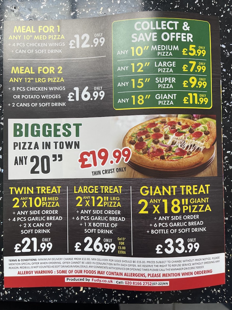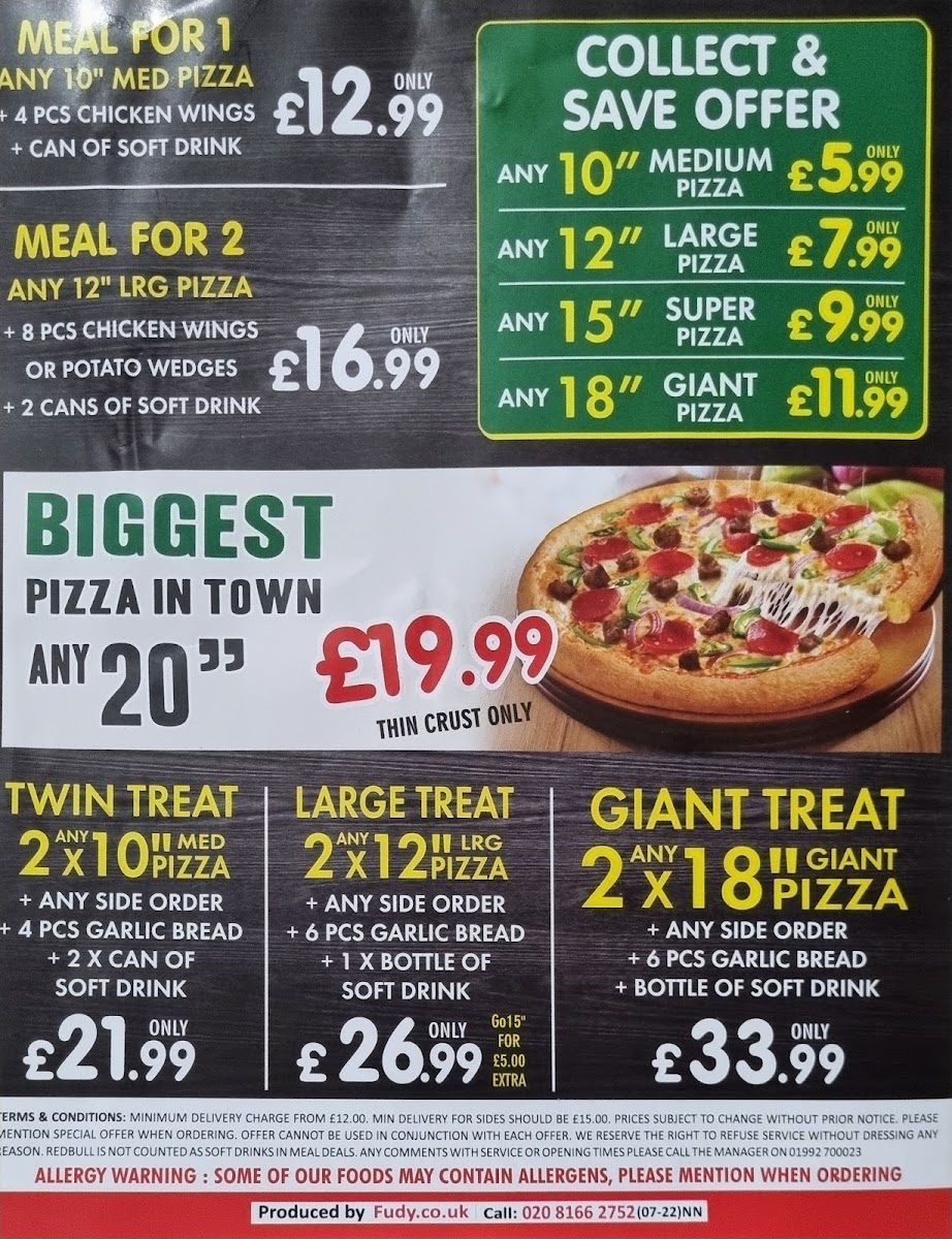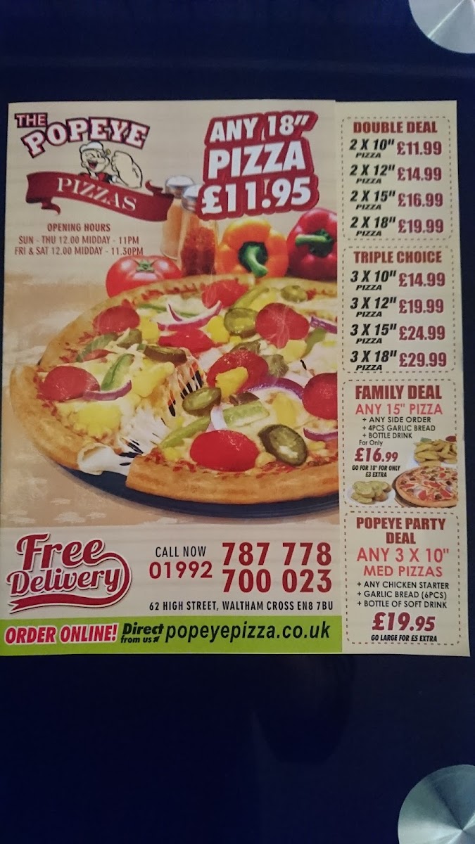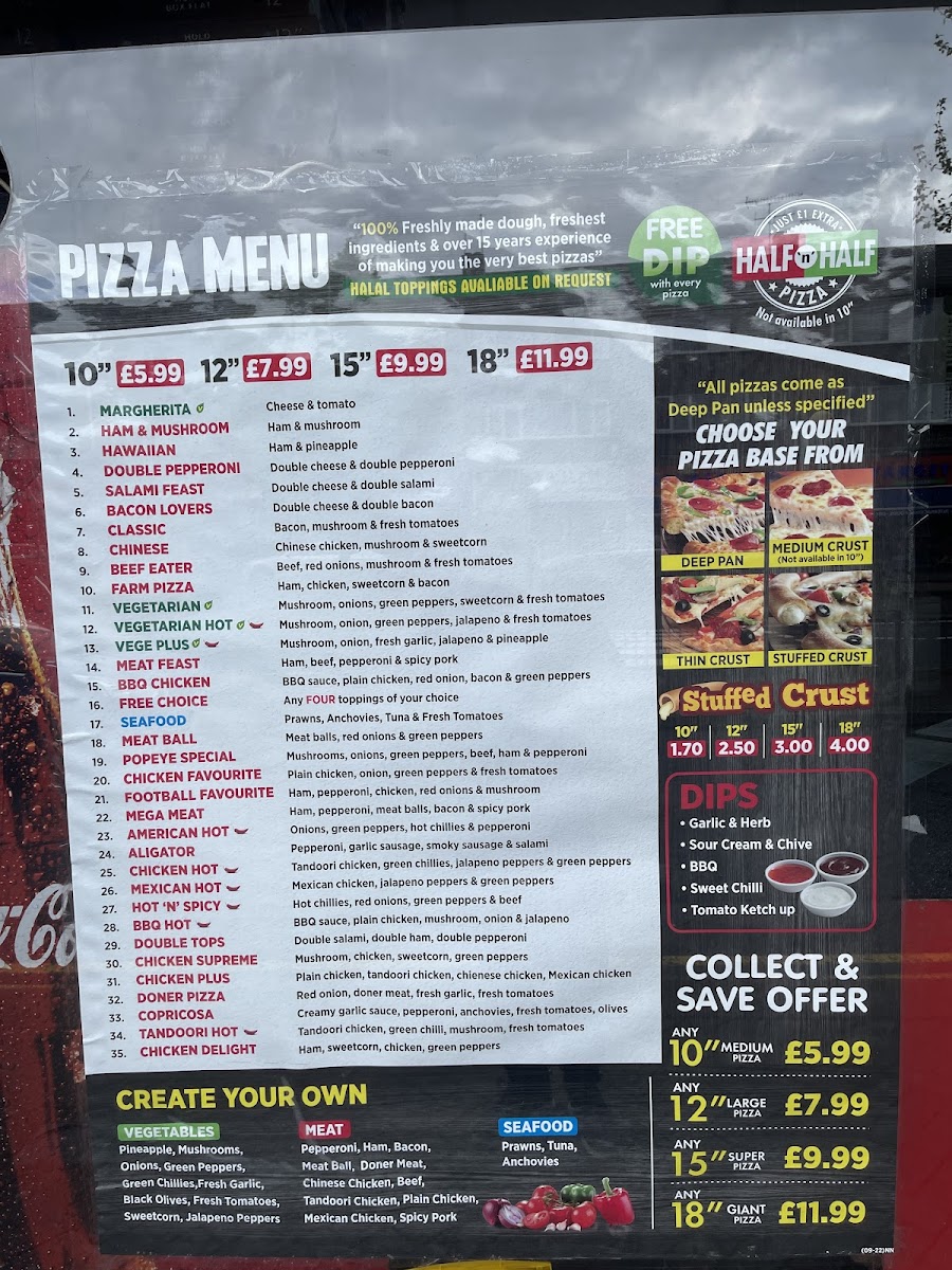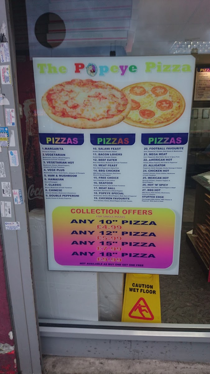 From a reviewer’s perspective, the menu at The Popaye Pizza offers a straightforward but satisfying selection, covering everything from classic sides to desserts and drinks at accessible prices. The side orders like Garlic Bread, Garlic Bread With Cheese, 10" Garlic Pizza Bread + Cheese, Potato Wedges, and Potato Skins (5pcs) + Cheese make great starters or add-ons, while the pasta options such as Meat Lasagne and Spaghetti Bolognese provide hearty alternatives to pizza. For lighter choices, the salads including Mixed Salad, Coleslaw, and Prawn Cocktail are simple but welcome additions. Dessert lovers can enjoy sweet treats like Chocolate Fudge Cake, Strawberry Cheesecake, Tennessee Toffee Pie, Banoffee Pie, and Chocolate Mini Doughnuts, which round off the meal nicely. The drink selection features Can, Bottle, Redbull, and Sugar Free Redbull, and the pizza range includes popular choices such as Margarita, Vegetarian, Vegetarian Hot, Vege Plus, and Ham & Mushroom, ensuring there is something for both classic and vegetarian tastes. Overall, the menu is varied enough to suit different preferences while staying focused on familiar, comforting dishes.